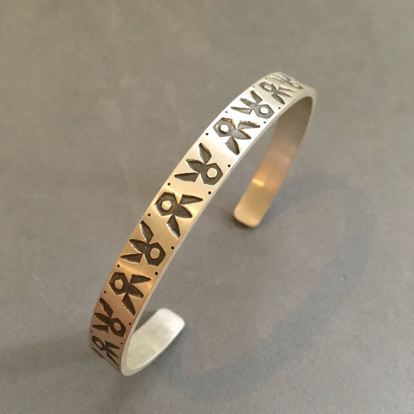 This is a nice and sturdy sterling silver cuff. It has been created using handmade stamps. I first stamp the pattern, then shape it into a bracelet. After polishing, I give the indents a patina to highlight the pattern.