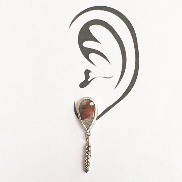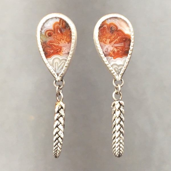 Tear dropped shaped Agua Nueva Agate gemstones have a great lacy pattern to them with earth-toned orange and white throughout. These are high quality stones in a truly one of a kind setting.