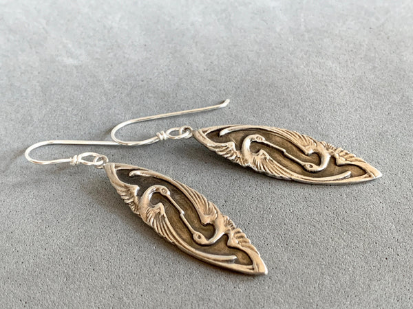 These earrings are made from solid sterling silver. The silver is heated and pressed into a vintage die. The birds were hand carved into a steel hub about one hundred years ago. Now they are born again by being made into a modern steel die. Not cast.