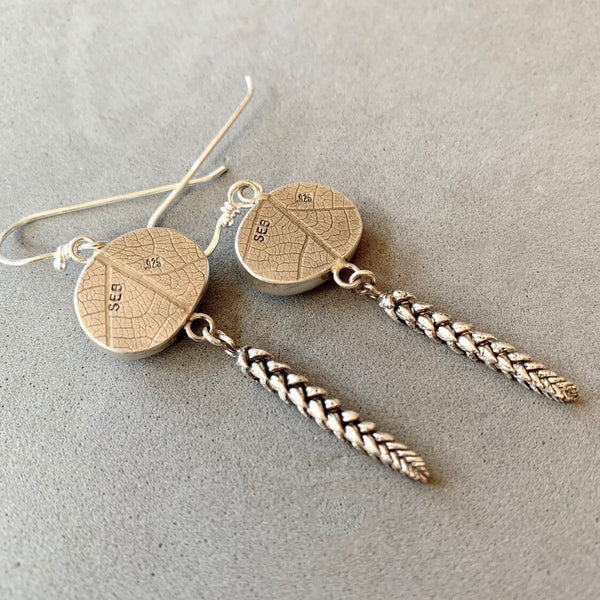 I first made the backing sheet of these earrings by rolling a leaf pattern into the silver. I then created the setting and added a handmade, cast real plant succulent to the setting. These give a nice elongated look to the earrings.