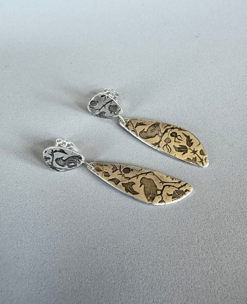 These were created with a texture plate that was rolled onto sterling silver. Then given a patina to highlight the images of Ravens, pomegranate fruits, vines and leaves.