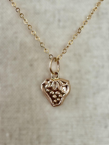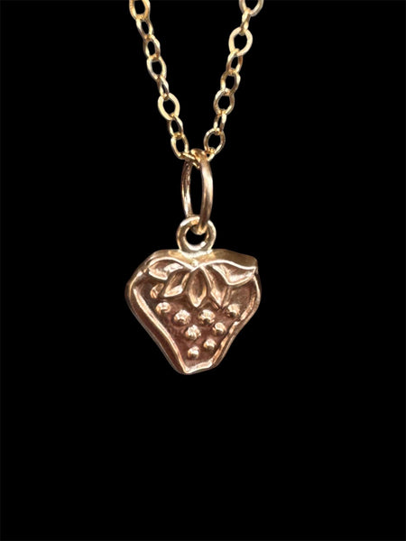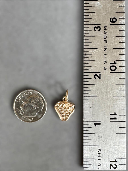 Here is a solid 14K yellow gold strawberry charm. The gold was pressed into a vintage jewelry die, not cast. The berry has some nice deep details in the seeds and leaves. It's the perfect strawberry for your charm collection.