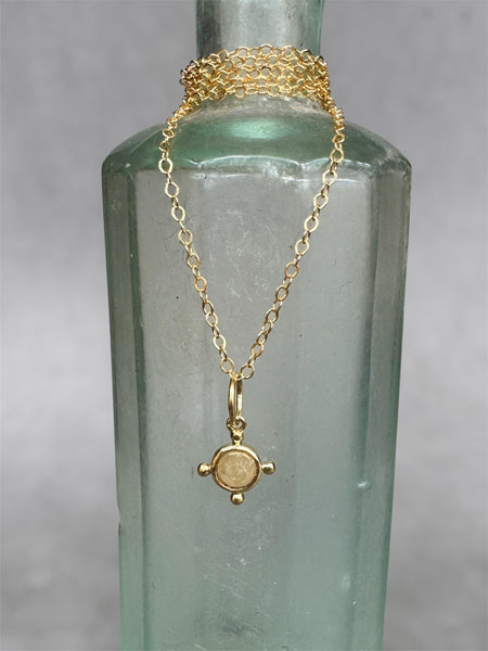 This charm was created with a 5mm, .61 carat Rose Cut diamond. It's a nice frosty white color with a hint of yellow. A nice match with the 18K yellow gold. It's entirely hand made with gold ball accents on four points.