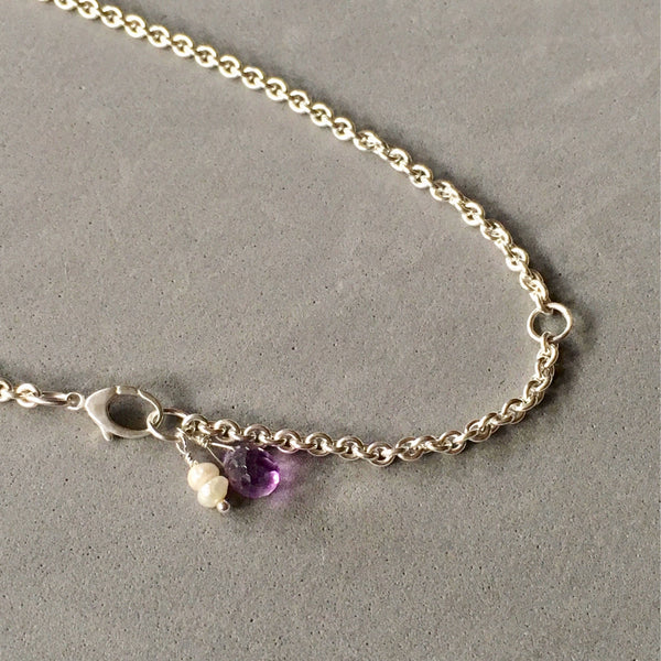 It attaches with a lobster clasp and can be worn at 16" or 18". Little amethyst and pearl charms.
