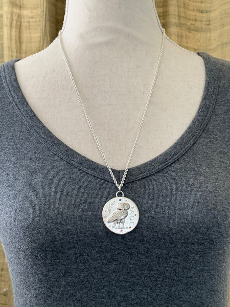(On the original ancient coin , the owl was on the back side and a portrait of Athena, the goddess of wisdom and warfare is on the front.)