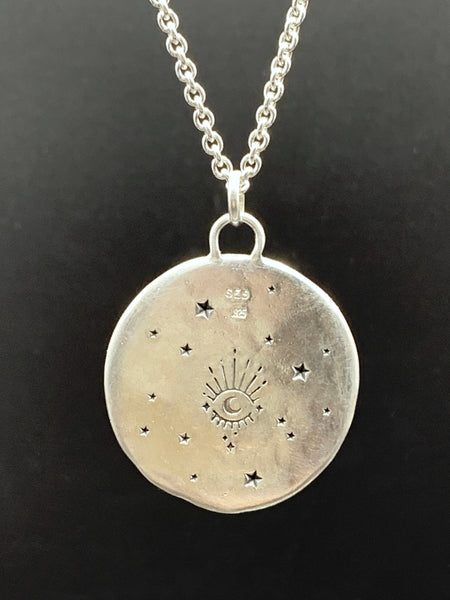 There are ten Sapphires gemstones in a variety of colors set in to the front. The sapphires range in 1.25mm-2mm in size. The backside is hand stamped with a celestial eye and stars.