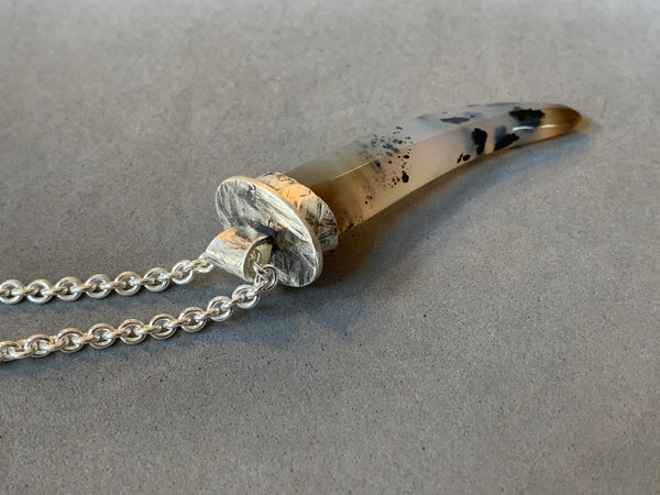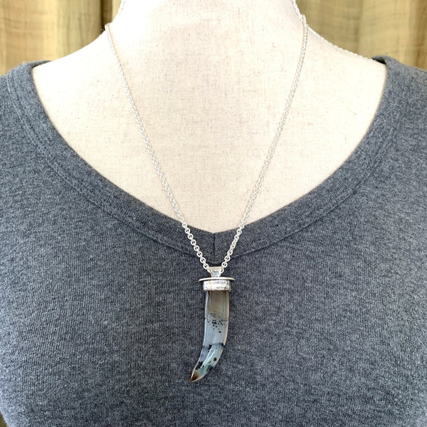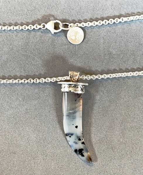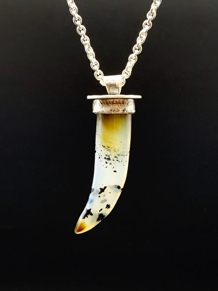 Beautiful Montana Agate pendant. This tooth or claw shaped stone is set in chunky silver with an interior post for security. It comes on a super thick sterling silver chain.