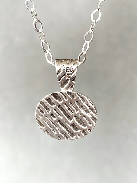 I created this pendant in sterling silver with a textured back side. The silver was run through a rolling mill with a steel texture plate to create the pattern on the back.