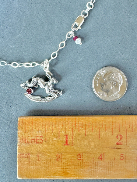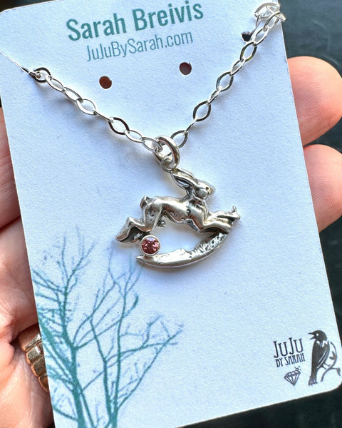 Rabbit jumping over the moon pendant in sterling silver. #mm rose colored zircon gemstone.