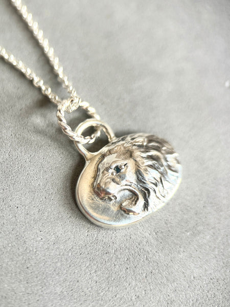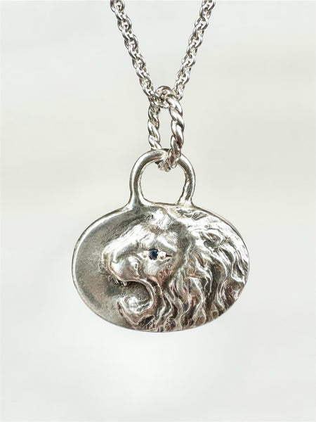 Roaring lion pendant in sterling silver with blue sapphire eye.