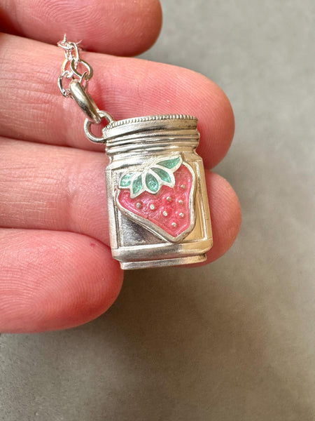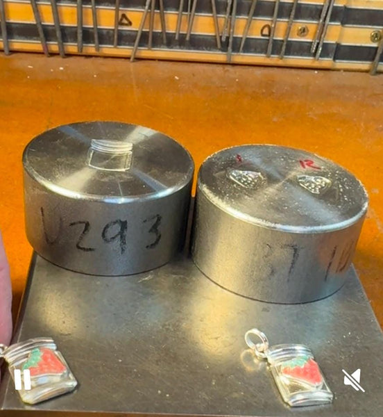 This pendant was created by using two separate impression dies and combining them to make a mason jar of strawberry jam. It's pressed solid sterling silver. I then added a colored resin enamel to give it a pop of color.