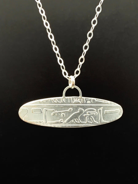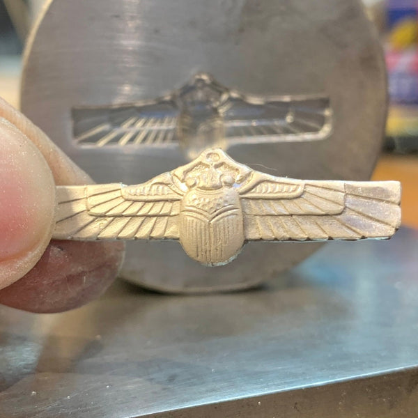 I made this pendant using a vintage jewelry die by pressing silver into a reverse image. It takes several passes of pressing and sawing to get all the details in the silver. The die is from the early 1900's, most likely during the Egyptian revival period after King Tut's tomb was discovered in 1922.