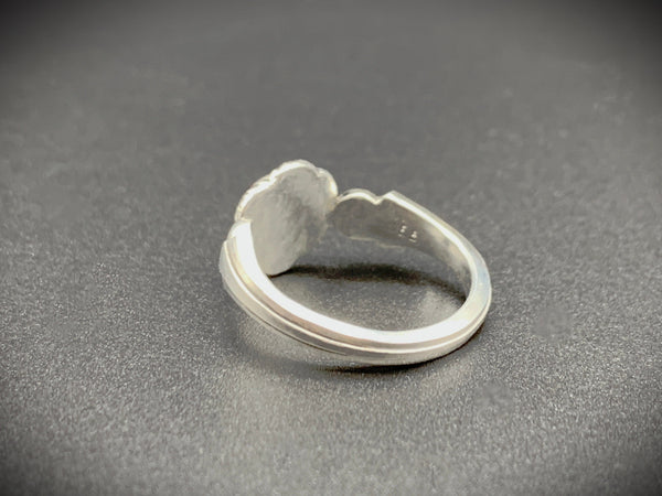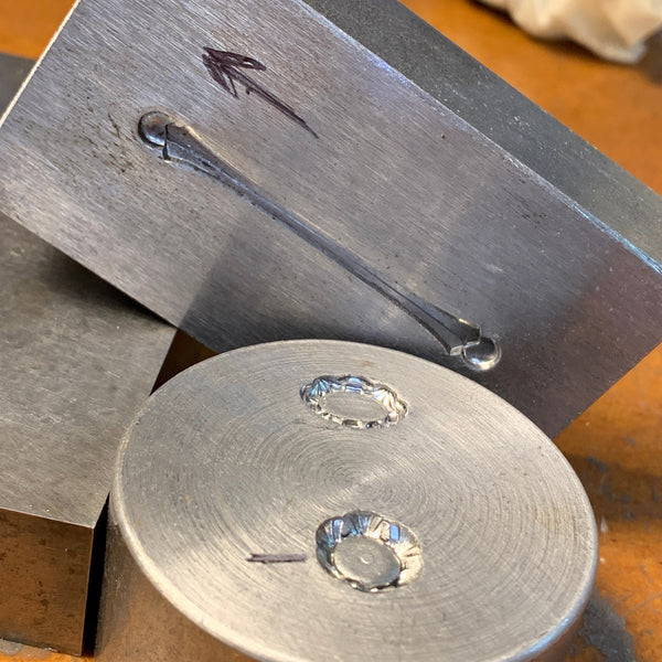 I made this ring using vintage jewelry dies that have been refurbished for modern jewelers. It's two parts, the shank and top that I press the silver into. It takes several times to get the impression and then to assemble the parts into the ring.