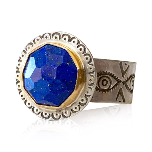 Lovely rose cut Lapis Lazuli ring with an 18K gold bezel.