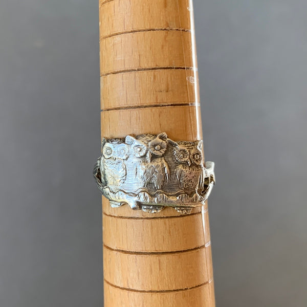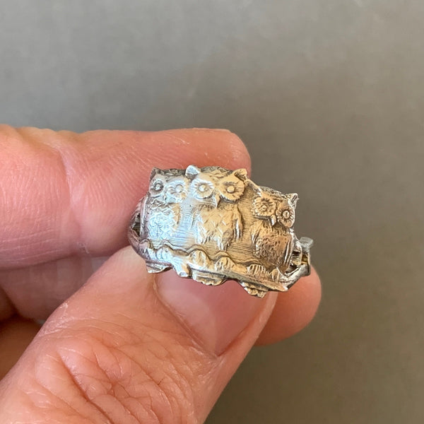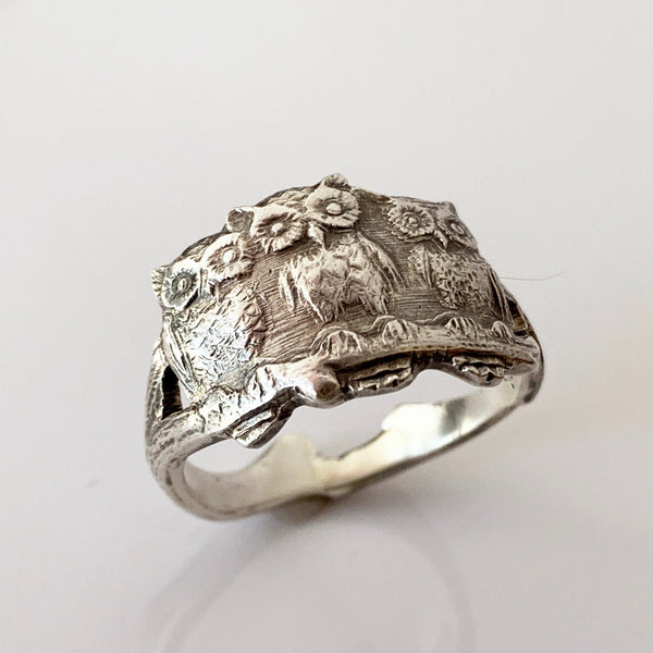 Owls on a Branch Ring in sterling silver, three owls, victorian