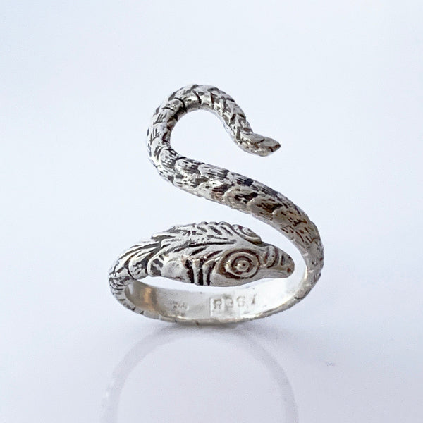 This ring was created using a vintage jewelry die that was in production at the turn of the 1900's. The process takes several steps of heating the silver up and pressing it into a mold. I do this several times to get a good impression. I then saw the snake out and shape it for a finger.