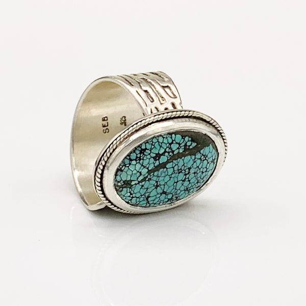 This piece of Tibetan Turquoise has great blue color and black webbing throughout. The shank is wide on one side and narrow on the other, with a low profile setting, making it comfortable to wear.